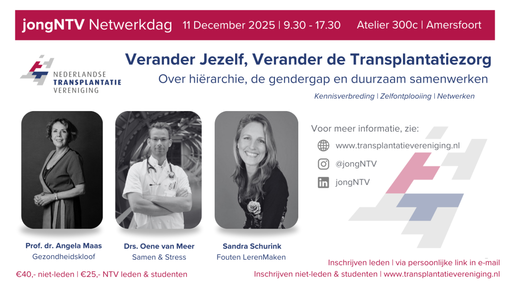 Op donderdag 11 december 2025 organiseert jongNTV een inspirerende netwerkdag met als thema: ‘Verander jezelf, verander de transplantatiezorg’. Tijdens deze dag staan hiërarchie en de gendergap in de zorg centraal.